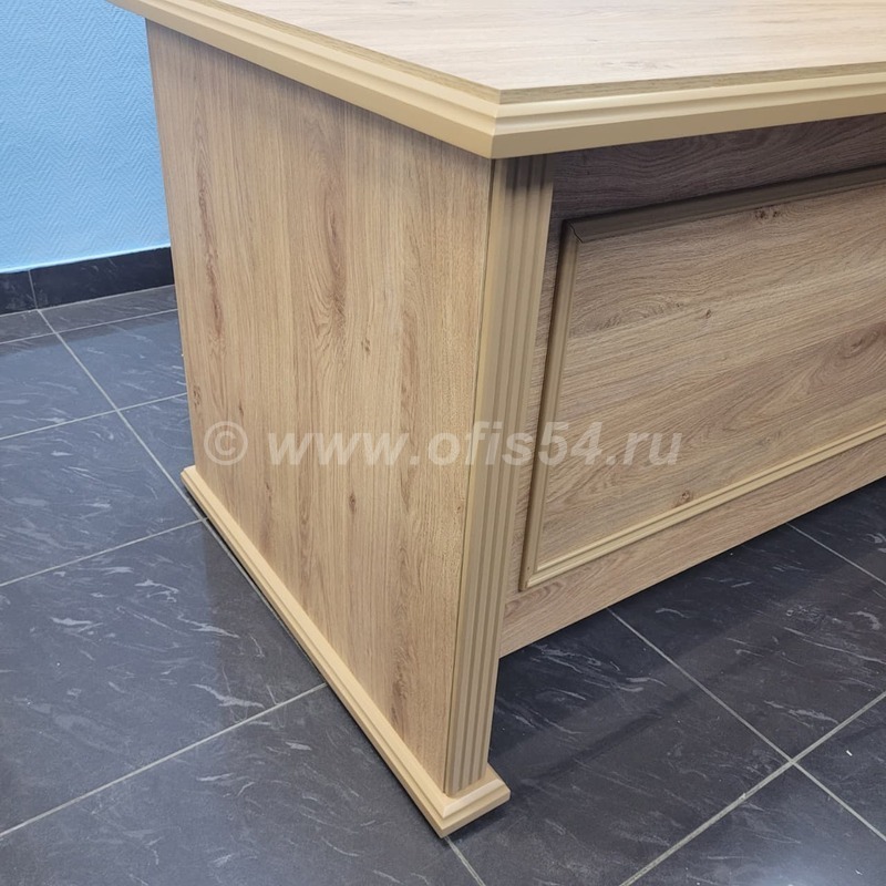 Столешница выполнена из ЛДСП с крашенным рамочным фрезерованным профилем из МДФ, опоры ЛДСП с крашенным рамочным фрезерованным профилем из МДФ. Фронтальная панель с крашенной раскладкой из МДФ.