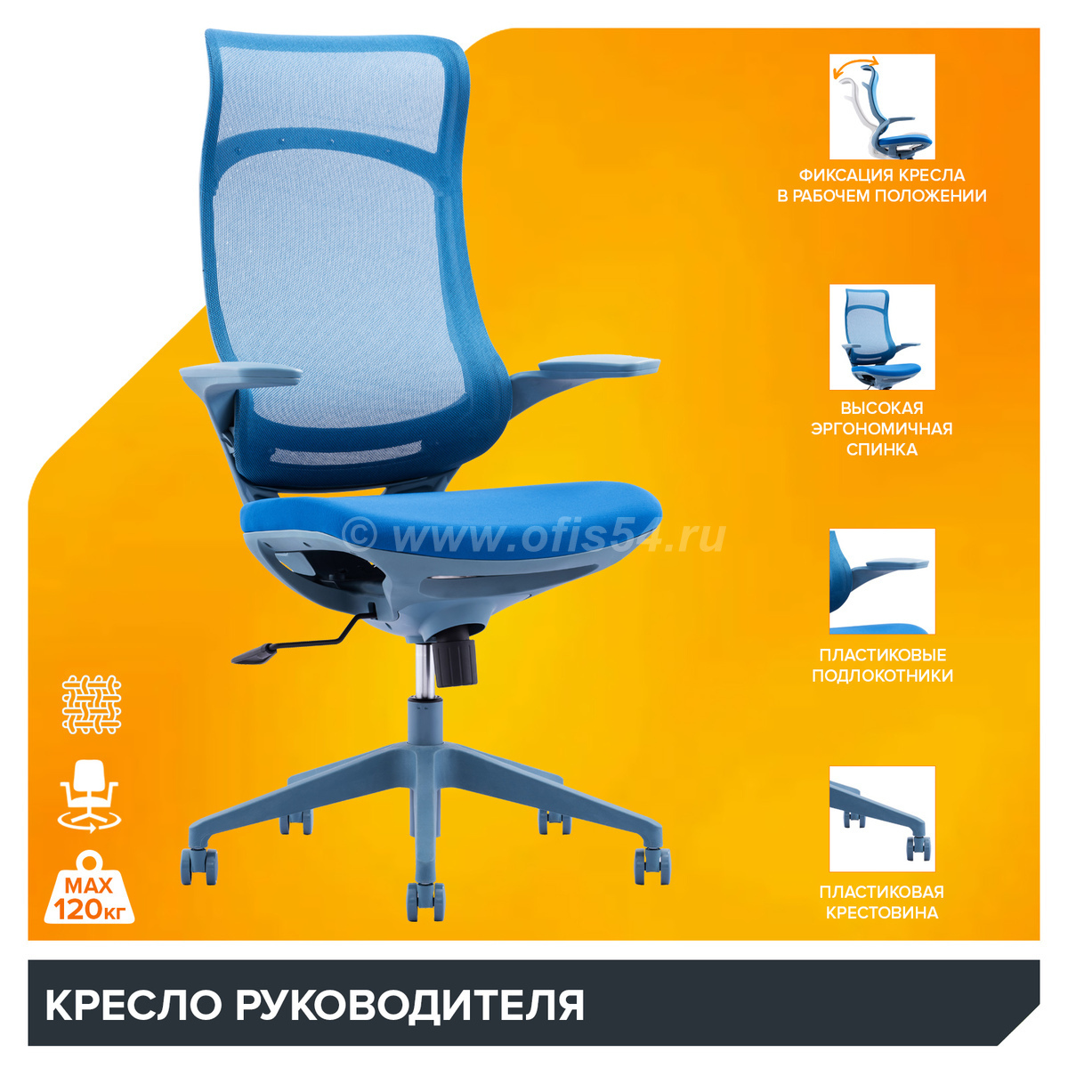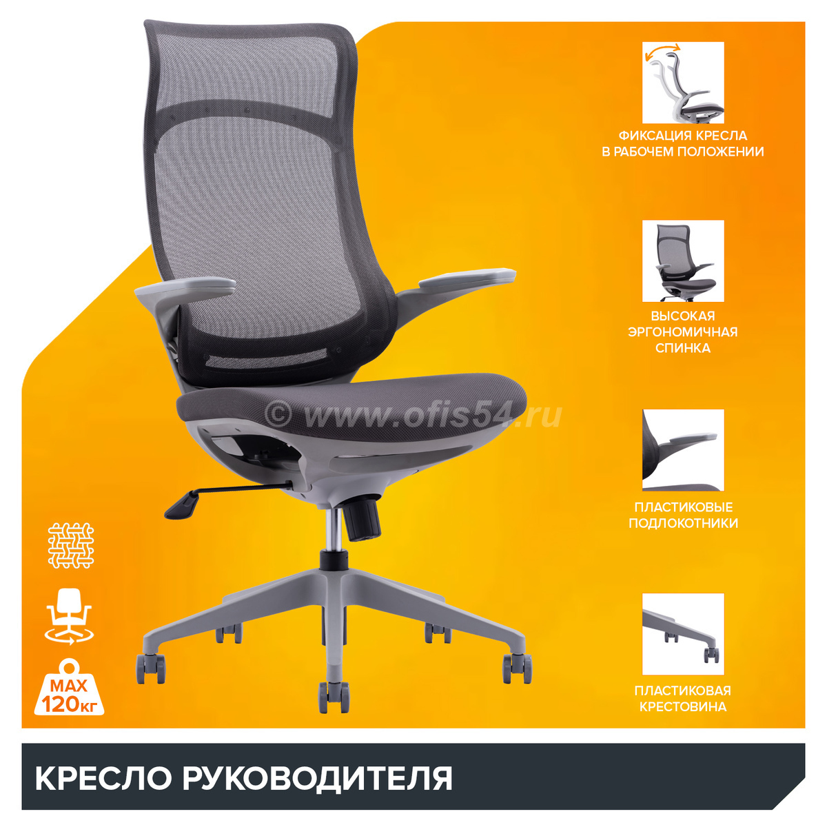 Кресло на пластиковом основании обладает прочной крестовиной, выдерживающей нагрузку до 120 кг.