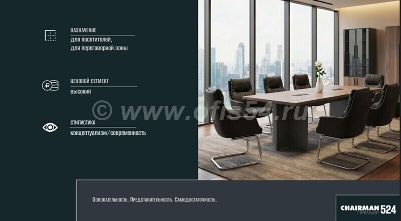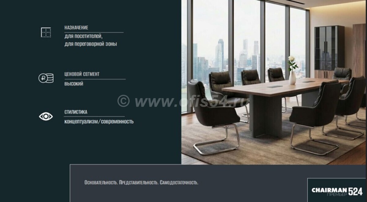 Идеально сочетается со столь же современным и оригинальным креслом руководителя CHAIRMAN 523, а также с корпусной мебелью для кабинета руководителя и переговорной зоны.