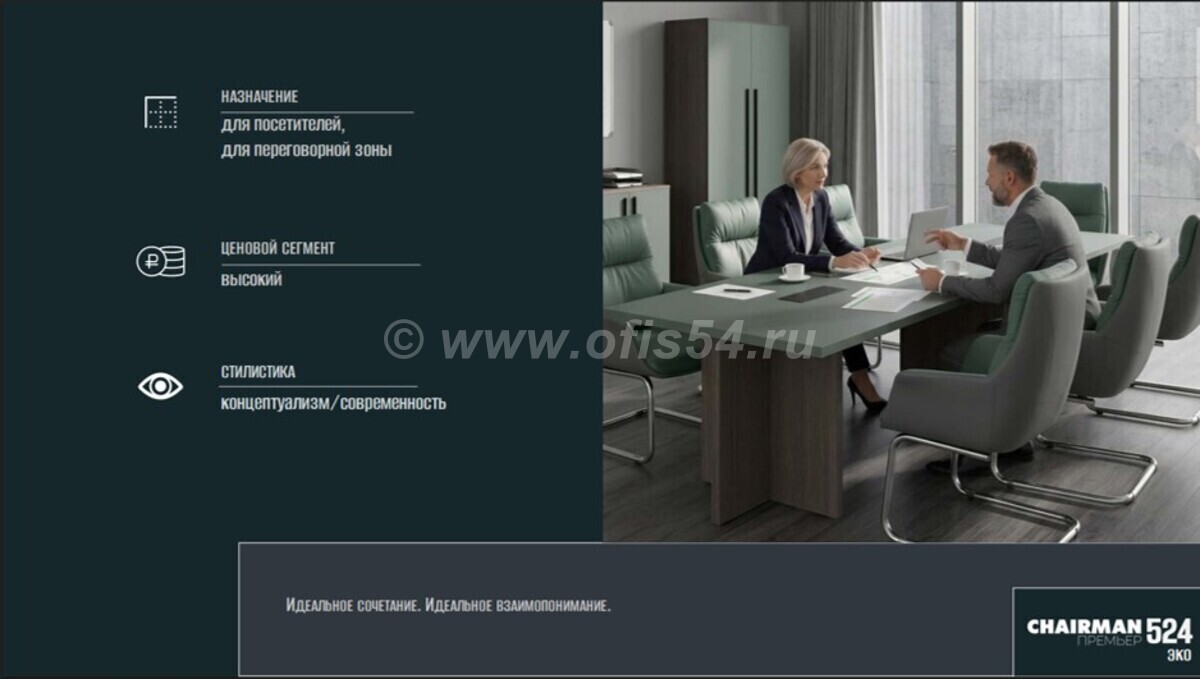 Идеально сочетается со столь же современным и оригинальным креслом руководителя CHAIRMAN 523 ЭКО, а также с корпусной мебелью для кабинета руководителя и переговорной зоны