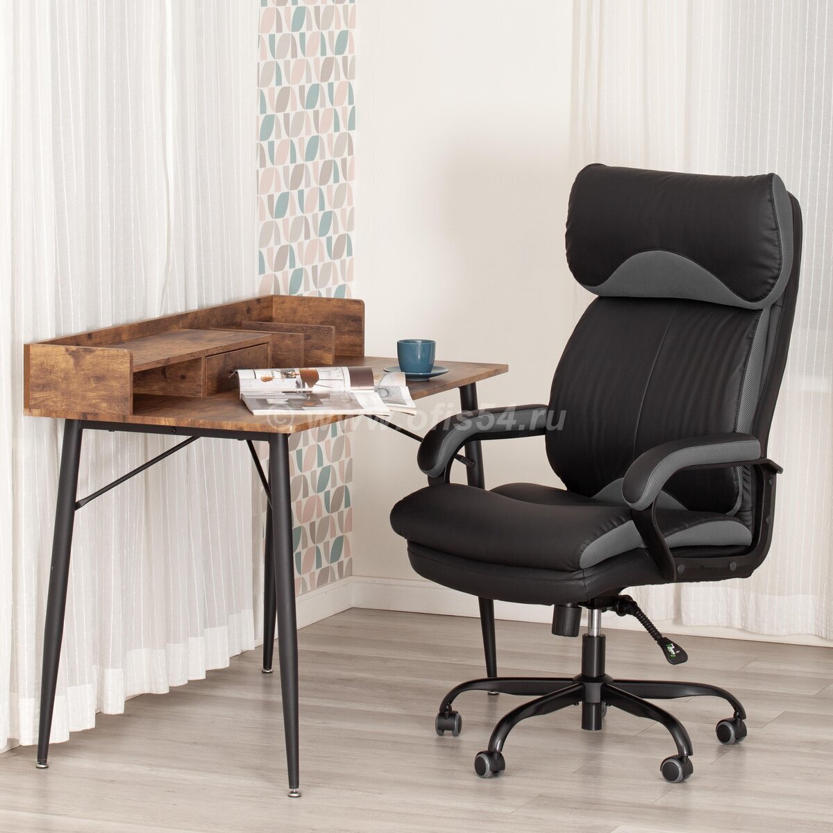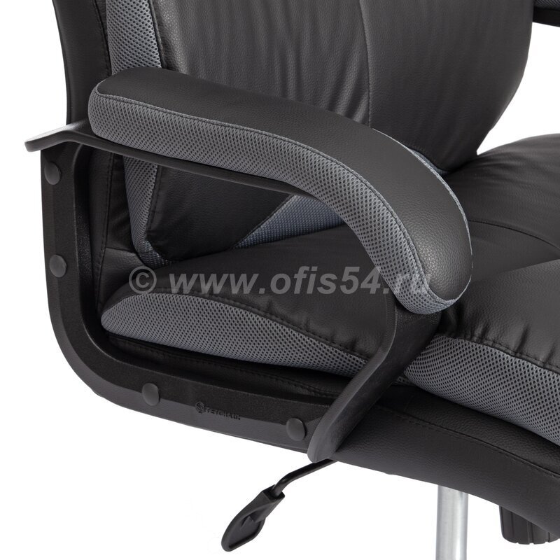 Офисное кресло, обитое прочной тканью с необычной текстурой или износостойкой экокожей в сочетании с сеткой, представлено в нескольких вариантах.